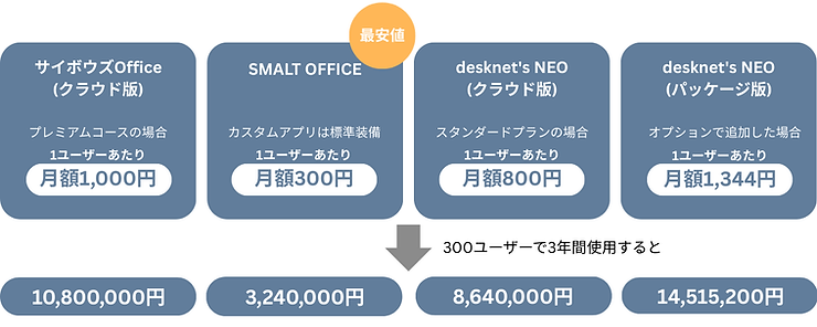 カスタムアプリを使うなら、SMALT OFFICEが最もコストパフォーマンスに優れていますね。1ユーザーあたり月額300円で、追加費用なしに標準でカスタムアプリが使えるのが特長です。一番高いものと比べても約月額1,000円の差があることがわかります。