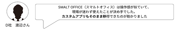 D社では、現場から「今と同じような使い勝手で移行したい」という声が多く、複数のツールを比較検討した結果、SMALT OFFICE(スマルトオフィス)の導入を選択。特に、これまで使っていたカスタムアプリや申請フローがほぼそのまま移行できた点が評価されました。