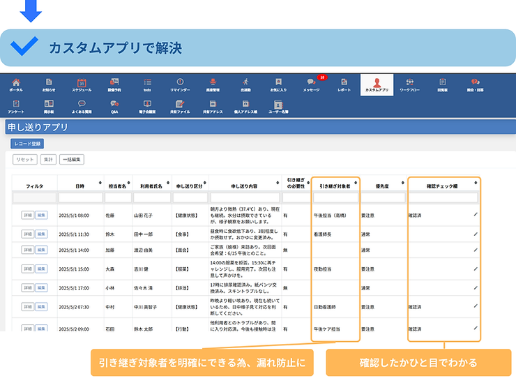 これまで口頭や紙メモで行われていた申し送りを、デジタルで一元管理。職種やシフトを越えて、全職員がリアルタイムで記録・閲覧できるため、「誰が何を伝えたか」が明確になります。