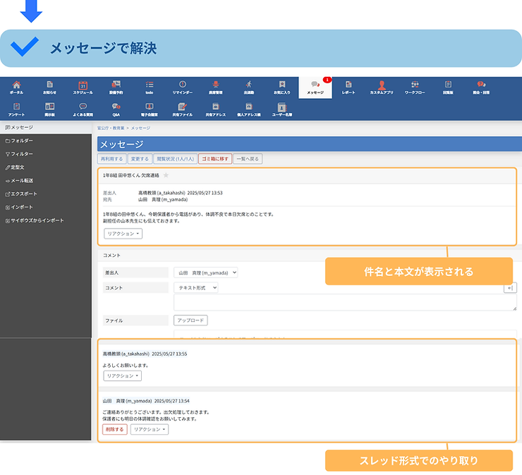 リアルタイムかつ履歴付きの情報共有が可能になり、過去のやり取りもすぐに確認できます。さらに、メンション通知によって必要な相手に確実に情報が届くため、連絡の見逃しや漏れを防止。これにより、教職員間の情報伝達が正確かつ迅速に行われ、確認や伝達の手間が減少。教育現場では、緊急時の対応や日常業務がスムーズになり、業務効率の向上と教職員の負担軽減につながります。