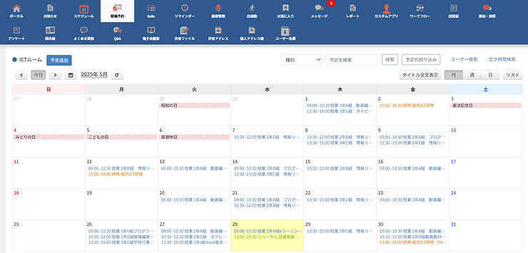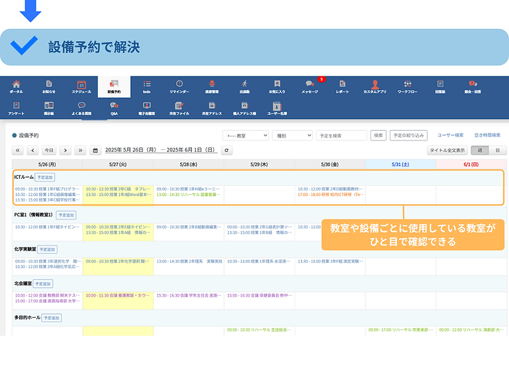 学校現場でよく聞かれる声——「会議前に資料が間に合わない…」「特別教室の予約がかぶってトラブルに…」「緊急の連絡がうまく伝わらなかった…」