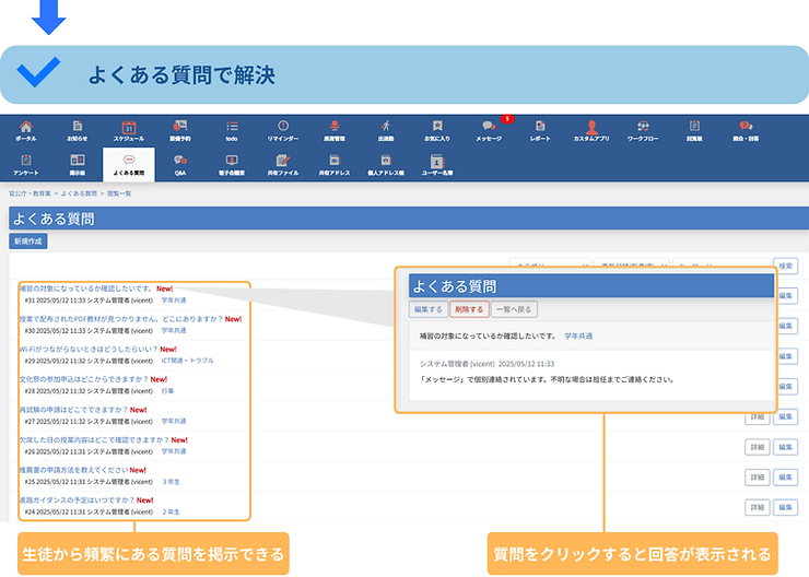 生徒にとっては先生に質問する際の心理的ハードルが下がり、わからないことを自分で解決しようとする力が育まれる一方で、教員側にとっても同じ質問への対応が減ることで負担が軽減され、限られた時間をより有効に使うことができます。結果として、質問する側も答える側も無理なく、効率的に情報をやり取りできる仕組みが実現します。