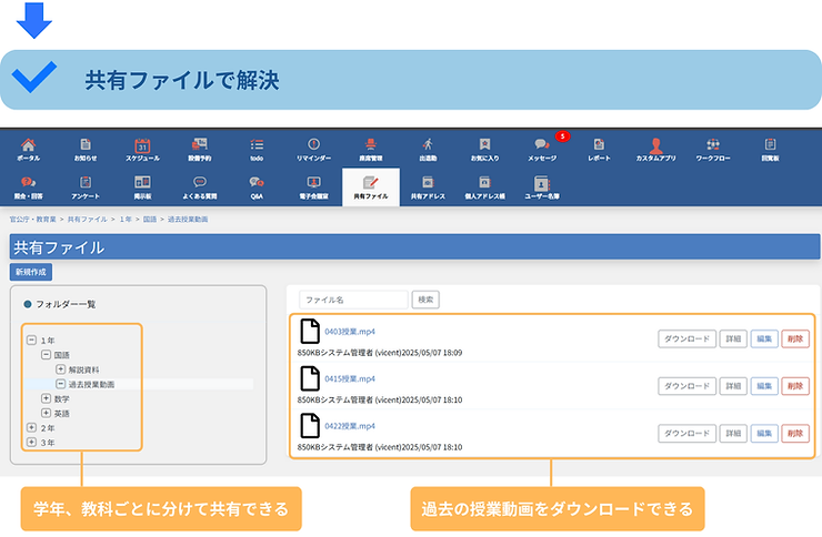 テスト前に復習したい内容があるのに、先生が忙しくて質問できない…。そんな時、生徒が自分のペースで復習できる環境はとても重要です。SMALT OFFICEなら、授業動画や解説資料を学年・教科別に整理・共有。欠席時のフォローや、理解が浅かった箇所の復習にも役立ち、生徒の自己解決力を高める学習環境が整います。