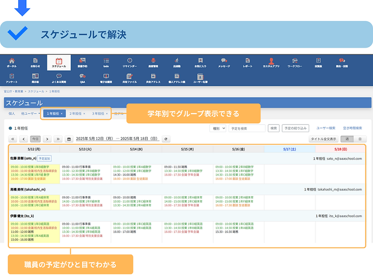 学校現場でよく聞かれる声——「先生に聞きたいけど、忙しそうで声がかけにくい…」「同じ質問を何度も受けて非効率…」「職員間のスケジュール調整がうまくいかない…」
