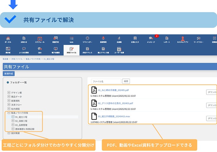 作業手順やコツを動画や写真付きで整理・保存でき、誰でも簡単にアクセス可能。フォルダごとのアクセス制限により、機密情報も安全です。これにより、教育の効率が上がり、技術が属人化せず、世代を超えて確実に受け継がれる環境を実現します。