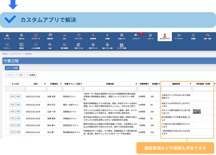 日報や品質報告、ヒヤリハットの記録が紙やExcelに分散し、提出・管理・集計に手間がかかるうえ、全体の傾向が見えにくい、、、そんな時、カスタムアプリを使えば、これらの報告をフォームで簡単に入力・提出。その結果、現場の状況をリアルタイムに把握でき、改善点の早期発見や再発防止につながるなど、記録が使える情報として活かされる環境が整います。