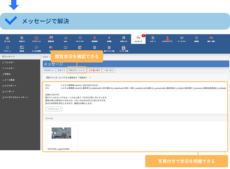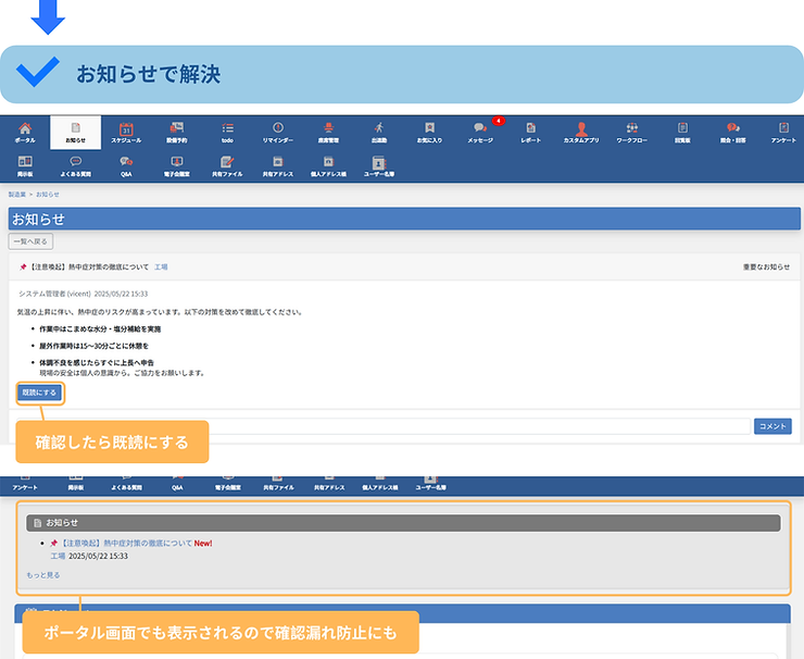 電話・FAX・口頭など連絡手段がバラバラなため、本社との伝達に時間がかかり、情報の行き違いや対応遅れが発生しがちです。通達を全工場・全部署へ即時に配信でき、誰が既読かも設定画面で一目瞭然。これにより、伝達漏れを防ぎ、迅速かつ確実な情報共有が可能になります。