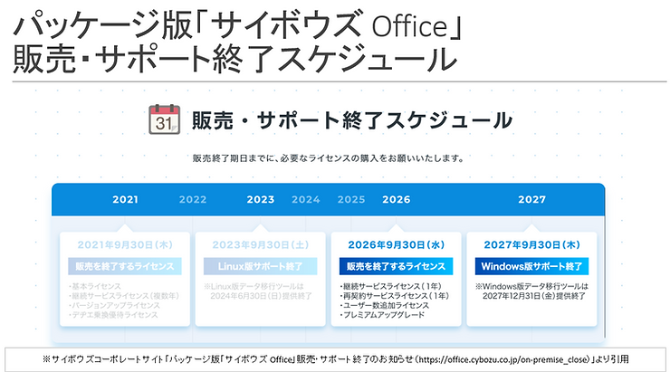 サイボウズOfficeパッケージ版の移行をスムーズに実施するために、何より皆さんが注意しなければならないのは、このWindows版データ移行ツールが2027年12月で提供が終了してしまいます!つまり、データの抽出が容易にできなくなり手遅れになってしまいます!!