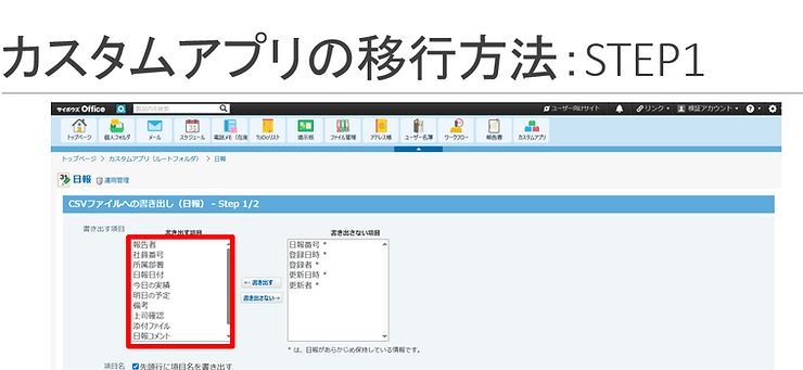 この様にカスタムアプリの移行をSTEP1「システム管理者アカウントで移行したい項目を指定してカスタムアプリ情報をサイボウズOffice からエクスポート」していきます。