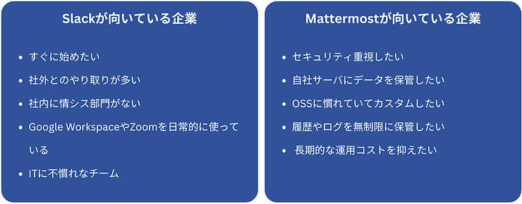 特にセキュリティポリシーが厳しい企業や自治体では、Mattermostの自社運用型が選ばれています。