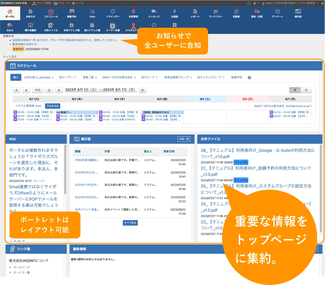 1画面完結型で、設定画面の「ポートレットの配置」から設定すれば、ユーザごとに最適な集約された表示が可能です。