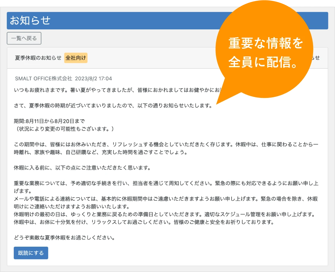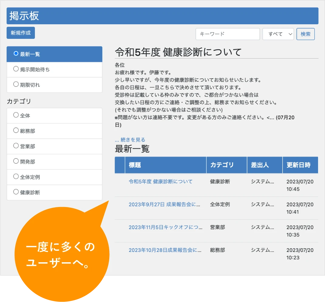 部署、カテゴリごとに掲示期間を定めて周知したい内容を公開します。ユーザからの返信も可能です。