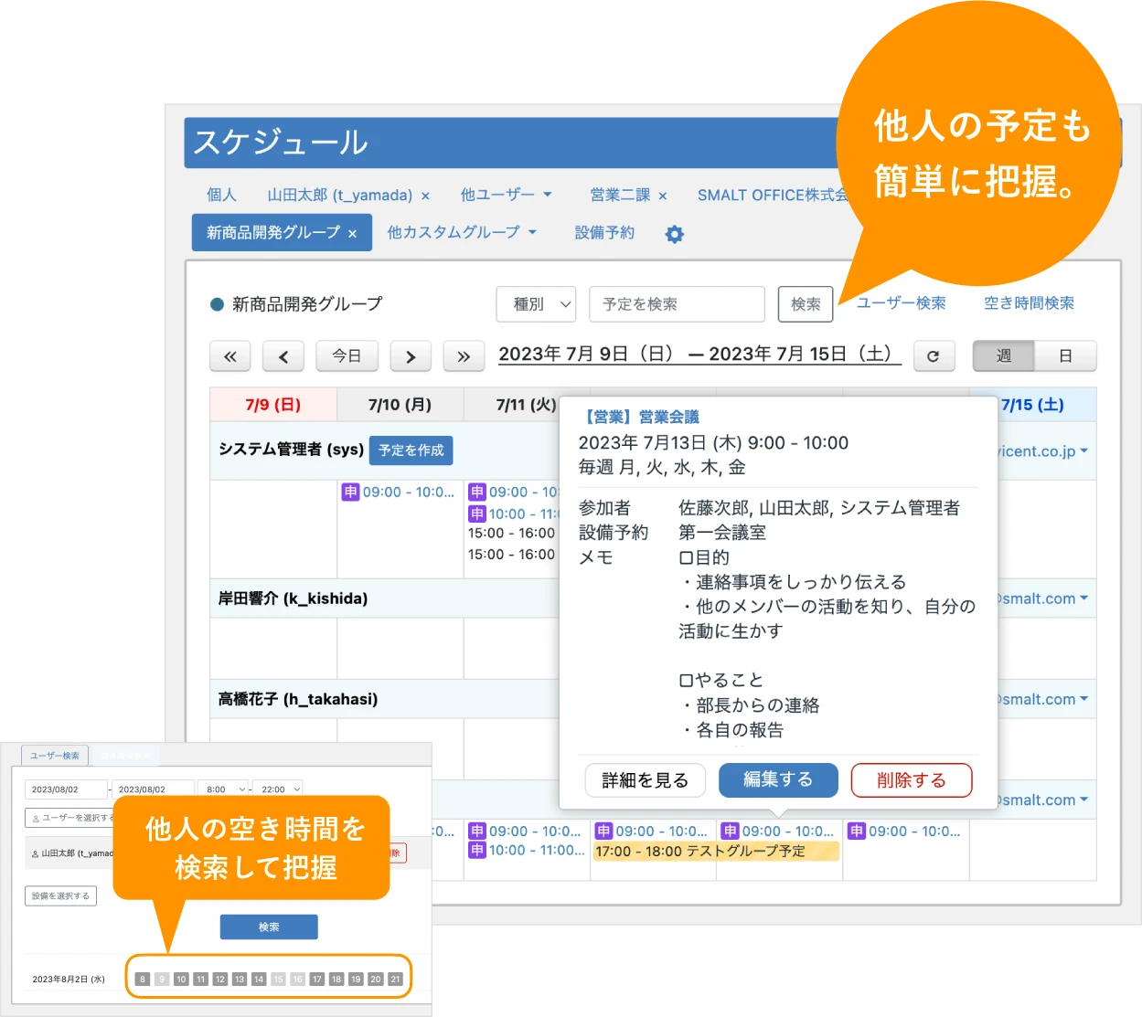 個人やグループの行動予定を管理、閲覧します。他ユーザや他グループの予定も確認できるので、日程調整が簡単です。