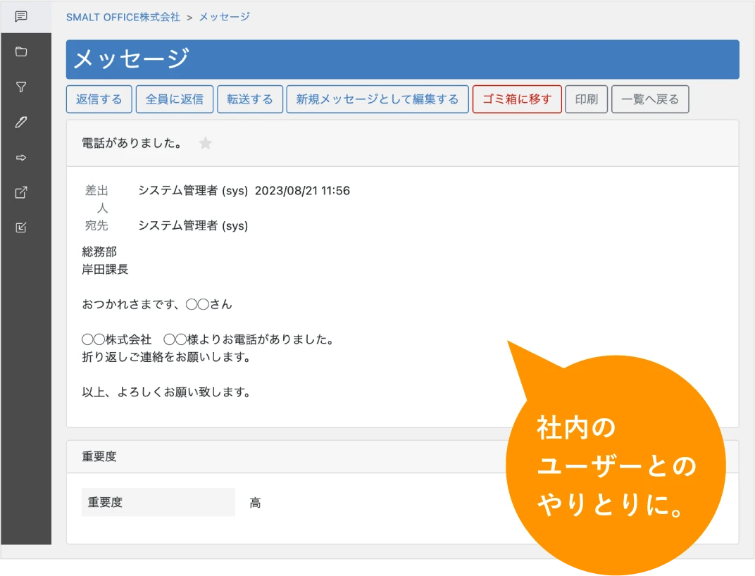 メールとは別に、社内のみでメッセージをやりとりできる機能です。メールへの転送を設定し、外出先から確認することも可能です。