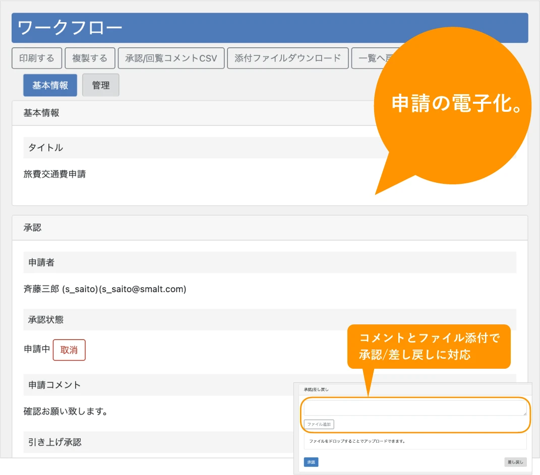 経理や人事・総務系の「交通費申請」「押印申請」「休暇申請」などの、申請+回覧+承認をSMALT OFFICE上で完結できます。