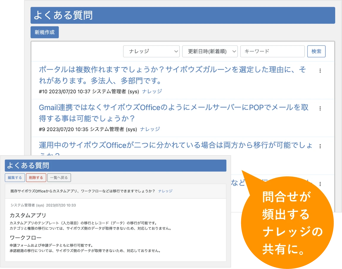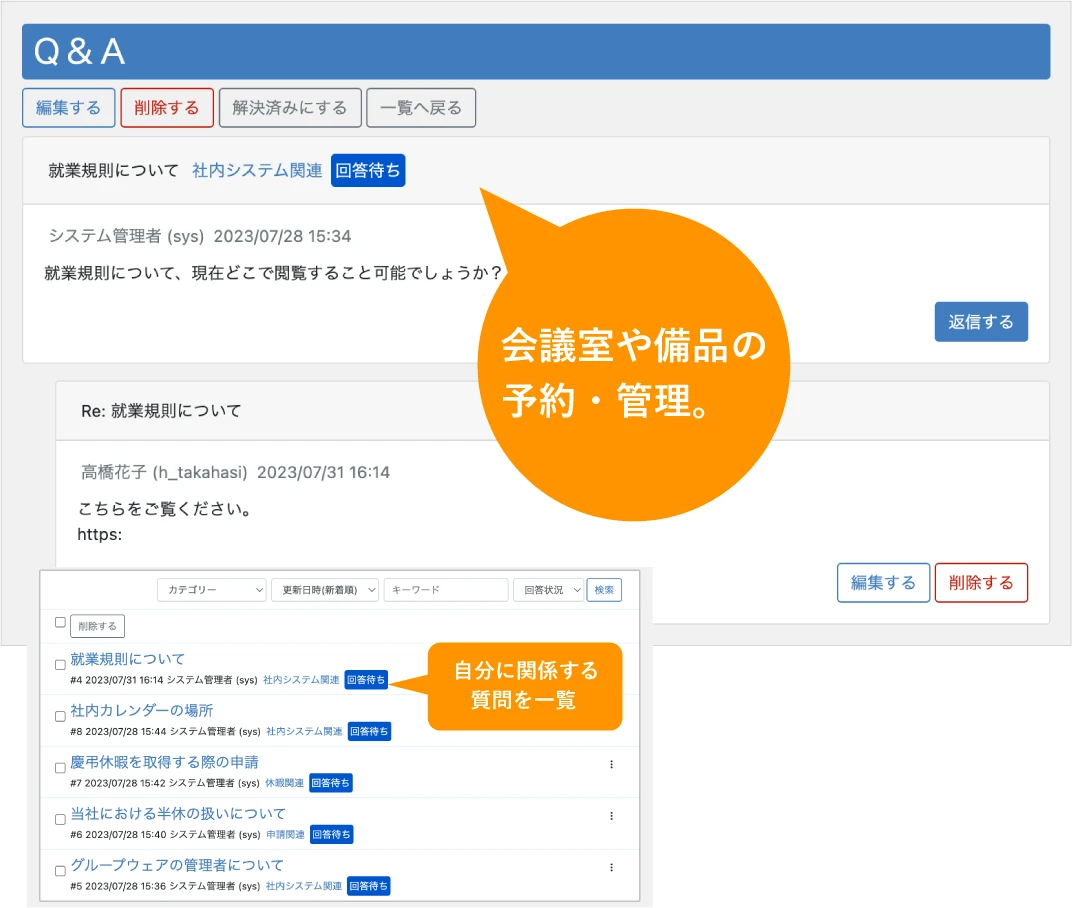 社内のユーザからのお問い合わせ窓口のようなイメージで利用します。任意の質問に対してやり取りを含めて共有します。